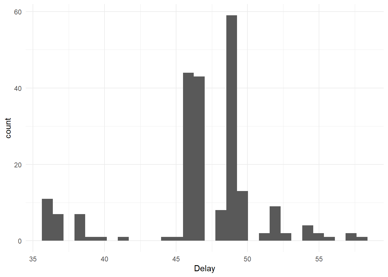 The mean and median days between the two experiments were 46.95 and 47.00, respectively.
