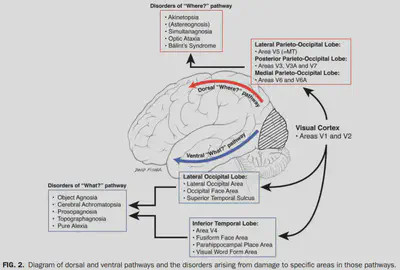 The “occipital stroke” hypothesis mentioned above suggests, by its formulation, a lesion to the primary visual cortices. However, as neuroscientists know, these brain regions, located at the extreme back of the brain, are mostly supporting lower level aspects of visual processing, and their damage is usually related to alterations of a somewhat different nature than of that above, such as vision loss, visual hallucinations, visual deformations, loss of color, movement, stereoscopy, etc.