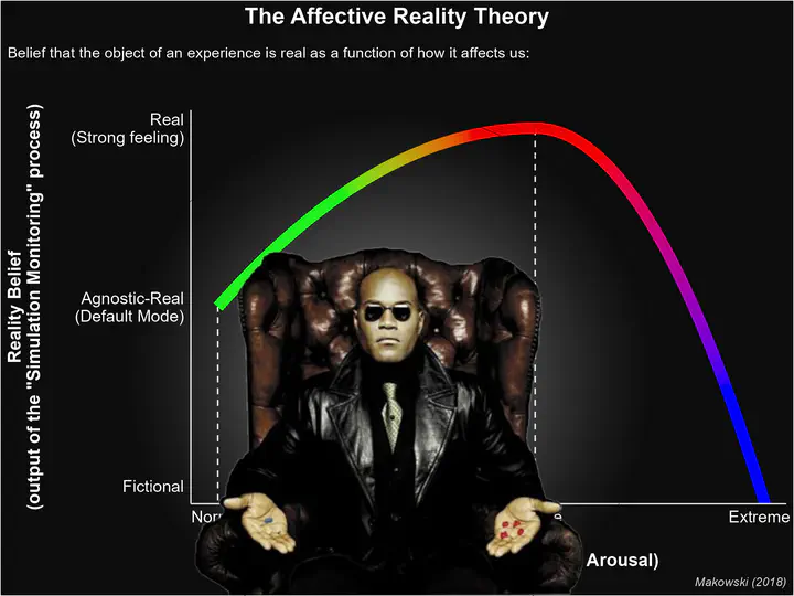 The Affective Reality hypothesis posits that simulation monitoring is strongly connected to “affective processing” 4 through a quadratic (inverse U-shaped) relationship. This means that stimuli associated with a stronger emotional and/or bodily reaction will preferentially bias our judgment towards “reality”. In other words, things that elicit feelings and/or bodily arousal, ceteris paribus, will be more likely to be classified as “real” (as opposed to fake). In fact, strongly emotional events will even “feel” more real: this transparent default prior and subconscious belief (“agnostic-real”) will be replaced in high-intensity scenarios by an explicit and conscious impression that the stimulus is very real, and, if logic opposes, that it “must be real” regardless.