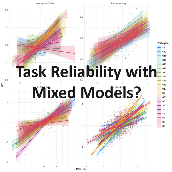 Recently, a new approach has emerged, suggesting to assess task sensitivity to inter-individual differences by leveraging mixed models (Rouder et al., 2024). In essence, the idea is to fit a statistical model that tests for the general population level effect of a manipulation in a given task/experiment (e.g., the impact of a variable Difficulty on another variable RT), and incorporates a random effect for each participant. This “full” mixed model essentially models the general population level by taking into account all the inter-individual effects and - as a side effect - estimates the effects of interest for each participant separately.