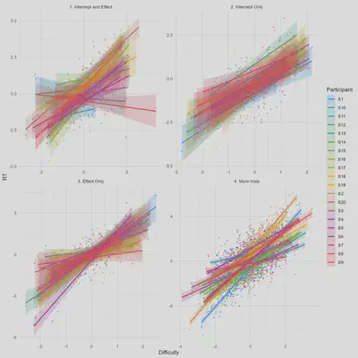 - Dataset 1: Both the RT intercept (the “baseline” RT) and the effect of the manipulation (the effect of difficulty) vary across participants.