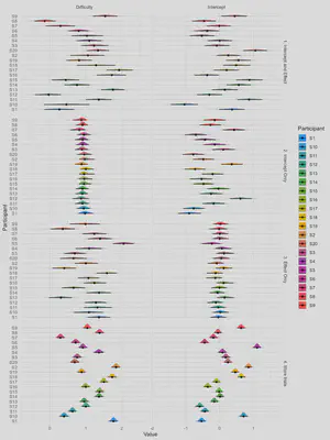 Now, let’s fit a Bayesian linear mixed model to each of these datasets (note that we specify the effect of Difficulty as a random slope in addition to estimating the random intercept).