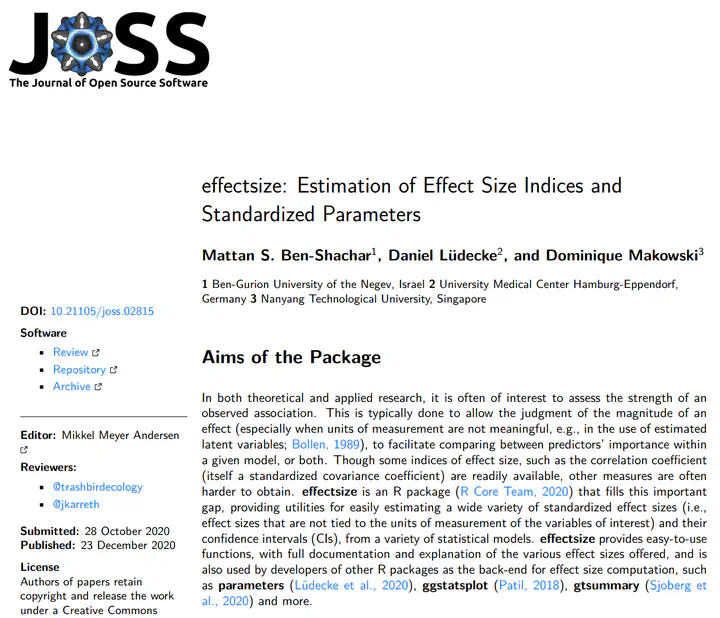 In both theoretical and applied research, it is often of interest to assess the strength of an observed association. This is typically done to allow the judgment of the magnitude of an effect (especially when units of measurement are not meaningful, e.g., in the use of estimated latent variables; Bollen, 1989), to facilitate comparing between predictors’ importance within a given model, or both. Though some indices of effect size, such as the correlation coefficient (itself a standardized covariance coefficient) are readily available, other measures are often harder to obtain. effectsize is an R package (R Core Team, 2020) that fills this important gap, providing utilities for easily estimating a wide variety of standardized effect sizes (i.e., effect sizes that are not tied to the units of measurement of the variables of interest) and their confidence intervals (CIs), from a variety of statistical models. effectsize provides easy-to-use functions, with full documentation and explanation of the various effect sizes offered, and is also used by developers of other R packages as the back-end for effect size computation, such as parameters (Lüdecke et al., 2020), ggstatsplot (Patil, 2018), gtsummary (Sjoberg et al., 2020) and more.