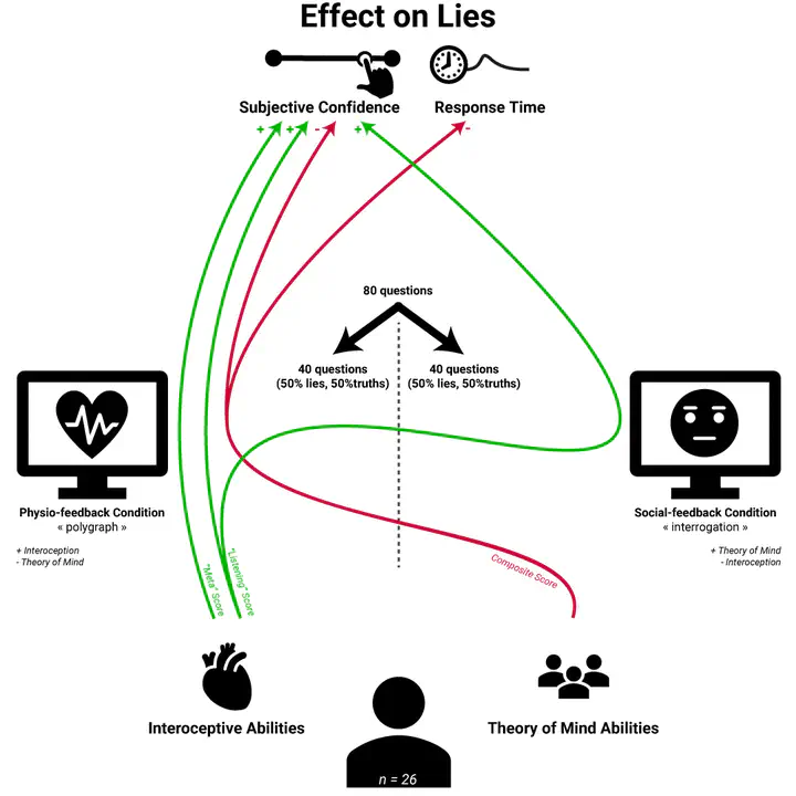While a large part of the deception literature focuses on lying detection, the factors contributing to one’s ability to lie remain unclear. The present study examined the contribution of Theory of Mind (ToM) and interoception on our ability to lie using a directed lie paradigm with two conditions (“Interrogation” and “Polygraph”), designed to enhance each of the two mechanisms. Given the relatively small sample size (n = 26 x 40 trials), special steps were taken to avoid false positives. Our results suggest that various facets of interoceptive abilities are positively related to the self-rated confidence in one’s own lies, especially when under the belief that bodily signals are being monitored (i.e., in the “Polygraph” condition). Beyond providing evidence for the role of the body in lying and raising interesting questions for deception science, these results carry practical implications for criminology and lie detection protocols.